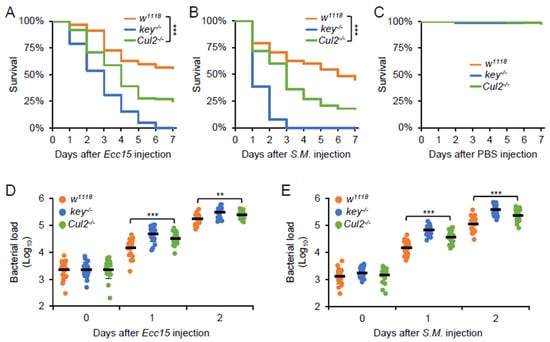Cul2 is essential for the fly defense against bacterial infection. (A) Adult flies, including w1118, key-/-, and Cul2-/-, were injected with Ecc15 (A), Serratia marcescens (S. M., (B)), or sterile PBS buffer (C). Survival curves of the indicated flies were analyzed. The numbers of flies are as follows. In (A), w1118: 150; key-/-: 145; Cul2-/-: 148. In (B), w1118: 149; key-/-: 146; Cul2-/-: 145. In (C), w1118: 150; key-/-: 147; Cul2-/-: 144. (D,E) Adult flies, including w1118, key-/-, and Cul2-/-, were injected with Ecc15 (D) or S. M. (E), followed by bacterial burden assays. In (A–C), the Log-Rank test was used for statistical analyses. In (D,E), the ANOVA test was used for statistical analyses. **, p < 0.01; ***, p < 0.001.