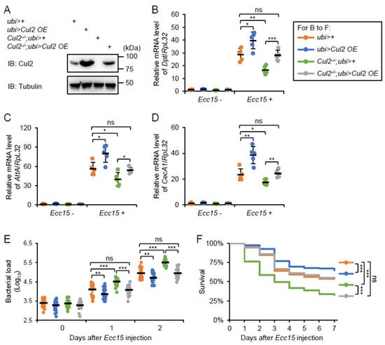 To further confirm the regulatory role of Cul2 in the Drosophila IMD antimicrobial immune defense, we performed rescue experiments by generating a ubi-Gal4-driven Cul2 overexpression (Cul2 OE) strain under the Cul2-/- genetic background (referred to as Cul2-/-; ubi>Cul2 OE). Similar to the act-Gal4, the ubi-Gal4 is another widely used strain that drives ubiquitous gene expression in Drosophila. Indeed, restoration of Cul2 expression (Figure 3A) rescued the decreases in AMP inductions in the Cul2 LOF flies after Ecc15 infection (Figure 3B–D). Moreover, the elevated Ecc15 burdens in the Cul2 LOF mutants were reversed by Cul2 OE (Figure 3E). Intriguingly, the overall survival of the Cul2-/-;ubi>Cul2 OE flies was comparable to that of the ubi>+ control flies (Figure 3F and Figure S2A). These data strongly indicate that Cul2 is a bona fide modulator in the Drosophila immune defense against bacterial infection. Consistently, overexpression of Cul2 alone benefited the fly immune defense against Ecc15 infection (Figure 3B–F).
