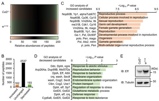 Cul2 mediates the expression of Eff in adult flies. (A,B) Age-paired w1118 and Cul2-/- flies were collected for a proteomic analysis (A). In (B), the number of increased and decreased candidates is shown. (C,D) GO analyses of increased (C) and decreased (D) candidates in the proteomic analysis. (E) Flies, including w1118 and Cul2-/-, were subjected to Western blot assays to monitor the expression levels of Eff. Tubulin was used as loading control.