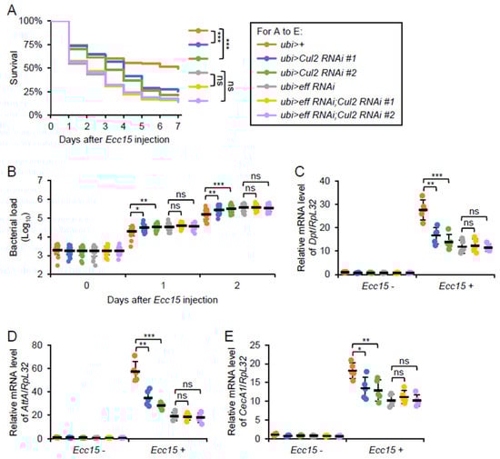 The Cullin-RING E3 ubiquitin ligases (CRLs) constitute a major class of E3 ligases that mediate diverse cellular processes, including cell cycle progression, signal transduction, and protein turnover [,,]. These multi-subunit complexes are built around Cullin family proteins, which serve as scaffolding components for assembling the CRL complex [,,]. We and our collaborators recently performed a genetic screening of the Drosophila Cullin family genes in the context of IMD signaling regulation. We identified Cullin 3 (Cul3) as an essential effector for the efficient activation of IMD signaling upon bacterial challenge []. In addition, we observed that Cullin 2 (Cul2) would be another potential modulator of the IMD pathway []. Although many details of the broad functional scope of Cul2 in Drosophila development have been established, its involvement in the fly antimicrobial immune defense remains poorly understood.