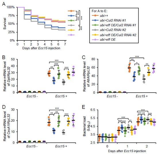 2.5. Cul2 Modulates Drosophila Antibacterial Immune Defense in an Eff-Dependent Manner