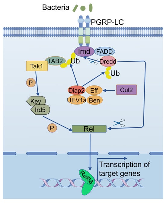 While the core molecular framework of the IMD pathway has been relatively well established, the regulation of this signaling cascade involves numerous accessory factors that are essential for maintaining signal fidelity and efficiency. Among these, ubiquitin-mediated post-translational modifications have emerged as critical mechanisms for fine-tuning IMD signaling [,,,]. E3 ubiquitin ligases, in particular, play a central role by conferring substrate specificity during ubiquitination, a process that dominantly governs the degradation, activation, or functional modulation of the substrate [,]. A series of pioneering investigations have demonstrated that some E3 ligases are integral to specific stages of the IMD signaling pathway, influencing both activation and resolution of the fly antimicrobial immune responses. For instance, during IMD signaling, the key adaptor protein Imd undergoes the 63rd lysine (K63)-linked ubiquitination modification, which is catalyzed mainly by the E3 ligase Drosophila inhibitor of apoptosis 2 (Diap2) []. Diap2 is also responsible for the K63-linked ubiquitination of some other downstream effectors, including the initiator caspase death-related ced-3/Nedd2-like protein (Dredd) [] and the inhibitor of κB (IκB) kinase γ (IKKγ), also known as Kenny (Key) []. To fulfill the E3 ligase enzymatic activity of Diap2, it needs help from the functional E2 complex consisting of ubiquitin-conjugating enzyme 5 (Ubc5), also known as Effete (Eff), ubiquitin-conjugating enzyme variant 1a (Uev1a), and ubiquitin-conjugating enzyme 13 (Ubc13), also known as Bendless (Ben) []. These modifications serve as a docking platform for signaling components, including transforming growth factor-β-activated kinase 1 (Tak1) and the IκB kinase (IKK) complex, which ultimately activate the transcription factor Rel [,].