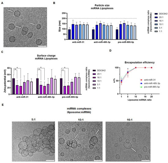 Characterization of DDC642 liposomes and their miRNA complexes. (A) Cryo-TEM image of DDC642 liposomes showing unilamellar vesicles with round shapes and elastic deformations (white arrows). Scale bar: 100 nm. (B) Particle size of miRNA lipoplexes (anti-miR-31, anti-miR-485-3p, and pre-miR-885-5p) at different liposome:miRNA ratios (20:1, 16:1, 10:1, 5:1, 1:1). A significant increase in size was observed upon complexation, with values remaining below 200 nm across all formulations. (C) Surface charge (zeta potential) of DDC642 liposomes and miRNA lipoplexes at various ratios. A significant reduction in zeta potential was observed for anti-miR-31, anti-miR-485-3p, and pre-miR-885-5p lipoplexes at 20:1 and 16:1 ratios. Statistical analysis was performed using two-way ANOVA, with comparisons made relative to DDC642 liposome. * p < 0.05. (D) Encapsulation efficiency (ee%) of miRNA in lipoplexes. High encapsulation efficiencies (~95%) were observed for all formulations except for the 1:1 ratio, which showed significantly lower efficiency (45–52%). (E) Cryo-TEM images of miRNA lipoplexes (anti-miR-31 shown as a representative example) at different liposome:miRNA ratios (5:1, 10:1, and 16:1). Aggregation and cluster-like structures were evident at the 5:1 ratio (white arrows), while more uniform mixed lipid bilayers with reduced aggregation were observed at 10:1 and 16:1 ratios (white arrows). Scale bar: 100 nm. All experiments were performed independently five times.