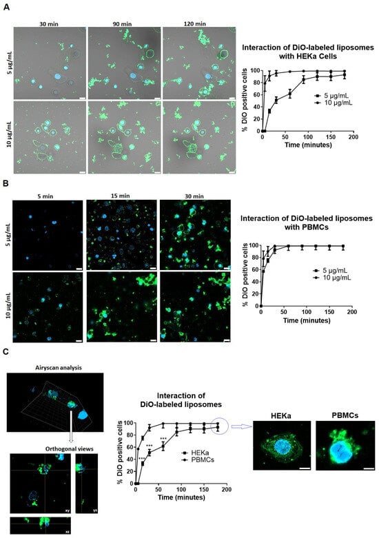 Time-dependent interaction of DiO-labeled liposomes with HEKa cells and PBMCs. (A,B) Confocal microscopy images illustrating the interaction of DiO-labeled liposomes with HEKa cells (A) and PBMCs (B) at concentrations of 5 µg/mL and 10 µg/mL. Liposomes were labeled with DiO (3,3′-dioctadecyloxacarbocyanine, perchlorate), emitting green fluorescence. The accompanying graph quantifies the percentage of DiO-positive cells over a 180-min period, based on the analysis of five distinct regions of interest, demonstrating a concentration-dependent interaction rate. Phase contrast images of HEKa cells were captured to observe cellular morphology. Scale bar = 20 µm. Images were obtained from five different regions per sample and experiments were performed in triplicate. (C) Comparison of the interaction between DiO-labeled liposomes and HEKa or PBMCs cells at concentration of 5 µg/mL. Confocal microscopy images were acquired using a Zeiss LSM980 microscope. Airyscan imaging was employed to enhance axial resolution. Orthogonal views were used to better highlight the interaction of liposomes with the cells. The graph compares the kinetics of the interaction, showing significantly higher interaction in PBMCs compared to HEKa cells until 90 minutes. Final images were recorded at 180 min, with scale bars of 10 µm for HEKa cells and 5 µm for PBMCs. Statistical analysis was performed using a two-way ANOVA test. *** p < 0.001.