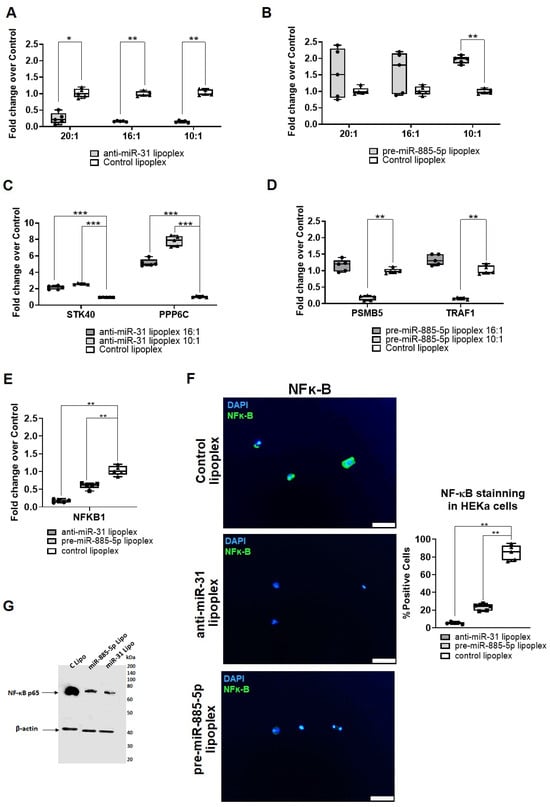 Effects of miR-31 and miR-885-5p modulation on NF-κB signaling and related gene expression in HEKa cells. (A,B) miRNA gene expression was quantified by RT-qPCR in UV-stimulated HEKa cells treated with anti-miR-31 (A) or pre-miR-885-5p (B) lipoplexes at varying ratios (20:1, 16:1, 10:1). Fold changes were calculated relative to control lipoplexes. Individual data points from five independent replicates are shown. Statistical analysis was performed using a one-way ANOVA test. * p < 0.05; ** p < 0.005. (C,D) Expression of miR-31 and miR-885-5p target genes after treatment with their respective lipoplexes at 10:1 or 16:1 ratios. Individual data points from five independent replicates are shown. Statistical significance was determined using a one-way ANOVA test compared to control lipoplexes.; ** p < 0.005; *** p < 0.001. (E) Expression of NFKB1 in HEKa cells following treatment with lipoplexes at a 10:1 ratio. Data are presented as mean ± SD of three replicates. Statistical analysis was performed using a one-way ANOVA test compared to control lipoplexes. ** p < 0.005. (F) Immunofluorescence staining of NF-κB (green) and nuclei (DAPI, blue) in HEKa cells treated with control lipoplex, anti-miR-31 lipoplex, or pre-miR-885-5p lipoplex. Scale bar = 50 µm. Quantification of NF-κB-positive cells is shown. Statistical analysis was performed using a one-way ANOVA test compared to control lipoplexes. Individual data points from five independent replicates are shown. ** p < 0.005. (G) Western blot analysis of cell lysates detecting NF-κB p65 protein, with β-actin used as a loading control. Control lipoplexes containing scrambled miRNAs.