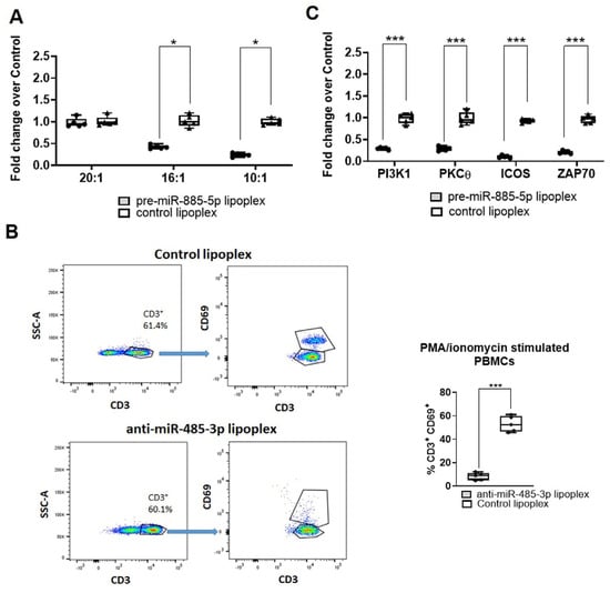 Impact of anti-miR-485-3p lipoplex treatment on PMA/ionomycin stimulated PBMCs. (A) Fold-change in miRNA gene expression (relative to control lipoplex) in PBMCs treated with anti-miR-485-3p lipoplex at varying ratios (20:1, 16:1, 10:1). miRNA expression was quantified by RT-qPCR. Results are presented as individual dots of five independent replicates. Statistical analysis was performed using a one-way ANOVA test. * p < 0.05. (B) Flow cytometric analysis of CD69 expression in CD3⁺ T cells after treatment with anti-miR-485-3p or control lipoplex. The gating strategy was performed by selecting CD3⁺ cells, followed by quantification of the percentage of CD69⁺CD3⁺ T cells. Representative flow cytometry plots (left) and quantification of the percentage of CD69⁺CD3⁺ T cells (right) are shown. Data are presented as mean ± SD of three replicates. Statistical analysis was performed using a Student’s t-test. *** p < 0.001. (C) Expression of PI3K1, PKCθ, ICOS, and ZAP70, key downstream regulators of T-cell activation, in PBMCs treated with anti-miR-485-3p lipoplex versus control lipoplex. Results are shown as fold-change relative to the control lipoplex, with data expressed as box plot with individual plots for five independent replicates. Statistical analysis was performed using a two-way ANOVA test. *** p < 0.001. Control lipoplexes containing scrambled miRNAs.