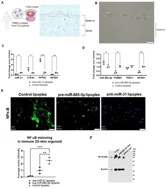Evaluation of anti-miR-31 and pre-miR-885-5p lipoplexes in immune 3D-skin organoids using PBMCs from CLE patients. (A) Schematic representation of the experimental setup involving PBMCs from CLE patients cultured in a T-skin model, created using https://www.biorender.com/. A representative histological image shows the dermal-epidermal structure of the model. Scale bar: 100 µm. (B) Immunofluorescent staining of DiO-labeled lipoplexes incubated in CLE immune 3D-skin organoids. DAPI marks nuclei, and lipoplexes (green staining) are indicated by arrows. Scale bar: 100 µm. (C) Quantitative RT-PCR analysis of miR-31 and its downstream targets (STK40, PPP6C, and NFKB1) following anti-miR-31 lipoplex treatment in immune 3D-skin organoids. Fold changes were calculated relative to the control lipoplex treatment. Data represent triplicate experiments, with statistical analysis performed using a one-way ANOVA test. * p < 0.05, ** p < 0.005, *** p < 0.001. (D) Quantitative RT-PCR analysis of miR-885-5p and its downstream targets (PSMB5, TRAF1, and NFKB1) following pre-miR-885-5p lipoplex treatment in immune 3D-skin organoids. Fold changes were calculated relative to the control lipoplex treatment. Data represent triplicate experiments, with statistical analysis performed using a one-way ANOVA test. * p < 0.05, ** p < 0.005. (E) NF-κB immunofluorescent staining in 3D immune skin organoids treated with control lipoplex, anti-miR-31 lipoplex, or pre-miR-885-5p lipoplex. Green fluorescence represents NF-κB expression, and DAPI marks nuclei. Scale bar: 200 µm. The dot plot, representing three independent experiments, quantifies NF-κB intensity. Statistical analysis was performed using a one-way ANOVA test comparing each lipoplex to the control., ** p < 0.005, *** p < 0.001. (F) Western blot analysis to NF-κB p65 protein in 3D-skin models, with β-actin used as a loading control. Control lipoplexes containing scrambled miRNAs.