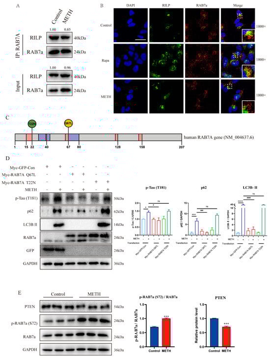 Qiu, H.; Zhang, M.; Li, M.; Chen, C.; Wang, H.; Yue, X. Methamphetamine and Methamphetamine-Induced Neuronal Exosomes Modulate the Activity of Rab7a via PTEN to Exert an Influence on the Disordered Autophagic Flux Induced in Neurons. Int. J. Mol. Sci. 2025, 26, 2644. https://doi.org/10.3390/ijms26062644