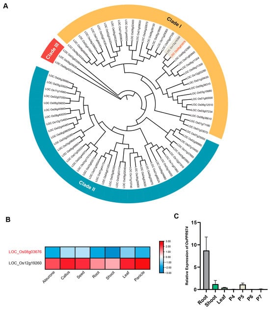 Phylogenetic and expression analysis of OsPPR674 and its homologs: (A) Phylogenetic tree of E2 subfamily PPR proteins in rice. (B) Expression profiles of OsPPR674 (LOC_Os08g03676) and PPR756 (LOC_Os12g19260) in rice tissues from the rice expression database. (C) Reverse Transcription Quantitative Polymerase Chain Reaction (RT-qPCR) analysis of OsPPR674 expression in various tissues, including roots, stems, leaves, and panicles, at developmental stages P4–P7.