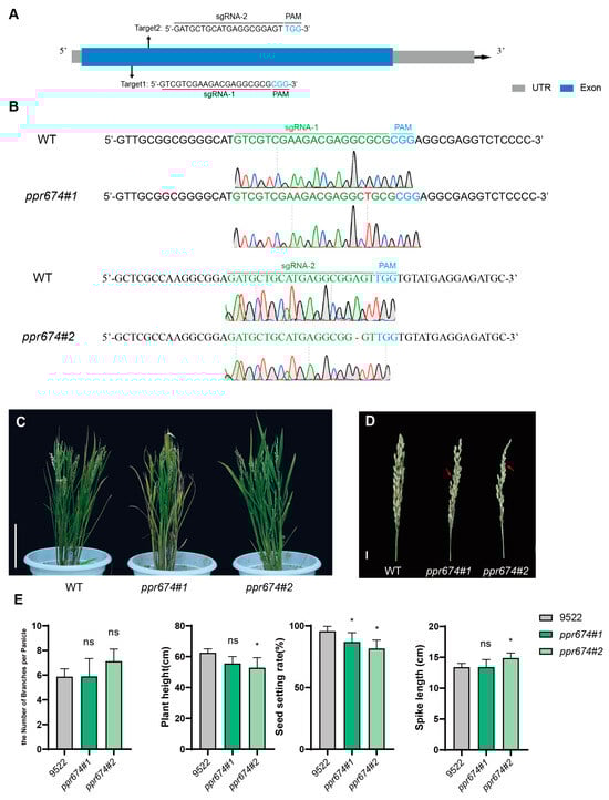 The Japonica rice cultivar 9522 was used for transgenic analysis and was preserved by the laboratory. The Osppr674 mutants were generated in 9522 (wild type) using a CRISPR/Cas9 system. Based on the coding sequence of OsPPR674 (LOC_Os08g03676), the guide RNA (gRNAs) targets in OsPPR674 and primers were selected via the E-CRISP Design Tool (http://www.e-crisp.org) accessed on 10 January 2021. Two single-guide RNAs (sgRNAs)—sgRNA-1 (5′-GTCGTCGAAGACGAGGCGCGCGG-3′) and sgRNA-2 (5′-GATGCTGCATGAGGCGGAGTTGG-3′)—were chosen for gene editing and incorporated into the CRISPR/Cas9 vector pYLCRISPR/Cas9Pubi-H. The sequence of the resulting vector was verified and introduced into Agrobacterium tumefaciens EHA105 to infect the 9522. The transgenic rice lines were subsequently confirmed by sequencing the PCR products, and two mutant lines, ppr674#1 and ppr674#2, were used for subsequent phenotypic assays. The wild-type and transgenic plants were grown under natural field conditions from July to November 2024 in Changsha, China (28°11′ N, 112°58′ E). The number of branches per panicle and plant height were measured from 10 plants in the paddy fields at full maturity. The spike length and seed-setting percentage were measured manually. The samples’ normal distribution was assessed using GraphPad Prism 9.0 (San Diego, CA, USA) software via a Shapiro–Wilk test. Data were statistically analyzed via one-way ANOVA followed by Dunnett’s multiple comparisons test with adjusted p values or student’s t-test using GraphPad Prism 9.0 software.