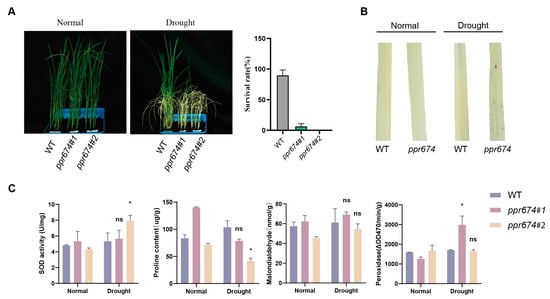 Physiological parameters, including proline content, superoxide dismutase (SOD) activity, peroxidase (POD) activity, and malondialdehyde (MDA) content, were measured in ppr674 mutants and WT plants under normal and drought conditions. Appropriate kits and protocols were used to evaluate physiological responses and antioxidant capacity under abiotic stress.