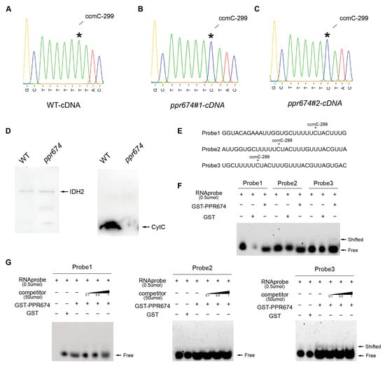 The Western blot analysis revealed significant differences in protein levels between the wild-type (WT) and ppr674 mutants. Using IDH2 as the mitochondrial loading control, the levels of Cytochrome C were markedly reduced in the mutants compared to the WT plants (Figure 5D). This reduction in Cytochrome C indicates a potential impairment in the mitochondrial electron transport chain, specifically in complex III, as Cytochrome C plays a crucial role in shuttling electrons between complex III and complex IV []. To confirm the RNA-binding capability of OsPPR674, RNA electrophoretic mobility shift assays (REMSA) were performed using purified OsPPR674-GST protein and three FITC-labeled RNA probes targeting the ccmC-299 site (Figure 5E–G). The results showed binding of OsPPR674 to the ccmC transcript at the site of probe3, confirming its direct involvement in RNA editing.