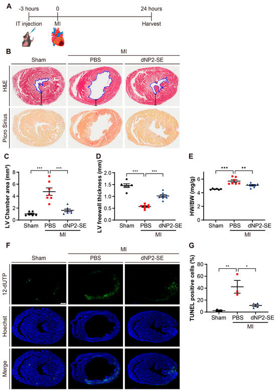Delivery of dNP2-SE via IT injection exerts cardio-protective effects upon MI. (A) Experimental scheme. A total of 200 nmol dNP2-SE or PBS was delivered via IT injection to adult (9-week-old) C57/Bl6 mice. MI was induced by LAD ligation 3 h post-injection. Hearts were harvested and analyzed 24 h post-MI. (B) Hearts were sectioned and stained with hematoxylin and eosin (H&E) or Picro Sirius Red. Representative images are shown. The LV chamber area was traced (shown in blue lines) and quantitated. The thickness of the LV free wall was also measured (shown in straight black lines). (C,D) LV chamber area and LV free wall thickness are presented as a graph. n = 6~7 per group; one-way ANOVA; *** p < 0.001. Bar represents the mean ±SEM. (E) HW/BW ratio was measured and shown. n = 6~7 per group; one-way ANOVA; ** p < 0.01, *** p < 0.001. Bar represents the mean ±SEM. (F) TUNEL staining of the heart sections was performed using the DeadEnd Fluorometric TUNEL System. Apoptotic DNA fragmentation was labeled with fluorescein-12-dUTP (green). Nuclei were stained with Hoechst 33342 (blue). Representative images are shown. (G) TUNEL-positive cells and the nucleus in the LV free wall areas were counted, and the ratio of TUNEL-positive cells is shown. n = 3~4 per group; one-way ANOVA; * p < 0.05, ** p < 0.01. Bar represents the mean ± SEM.
