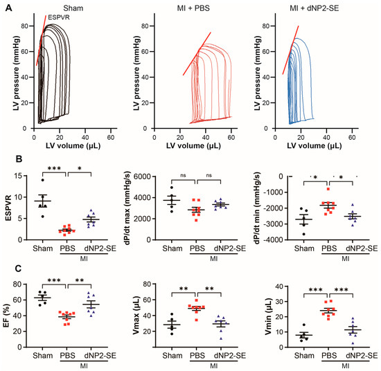 Delivery of dNP2-SE via IT injection preserves cardiac contractility upon MI. Hemodynamic analyses were performed 24 h post-MI to measure cardiac contractility. (A) Representative PV loops are shown. (B) End-systolic pressure–volume relationship (ESPVR), dp/dt max (mmHg), and dp/dt min (mmHg) are shown. (C) Ejection fraction (EF), LV end-diastolic volume (Vmax), and LV end-systolic volume (Vmin) are shown. n = 5~8 per group; one-way ANOVA; * p < 0.05, ** p < 0.01, *** p < 0.001. Bar represents the mean ± SEM.