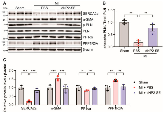 Delivery of dNP2-SE via IT injection prevents molecular abnormalities upon MI. (A) Protein lysates obtained from the hearts shown in Figure 2 and Figure 3 were subjected to western blotting. Antibodies against SERCA2a, α-SMA, phospho-PLN, PLN, PP1cα, and PPP1R3A were used. β-actin was used as a loading control. (B) The ratio of phosphorylated PLN over PLN is shown. (C) The western blots were scanned and quantitated. n = 3 per group; one-way ANOVA; ** p < 0.01, *** p < 0.001. Bar represents the mean ± SEM.