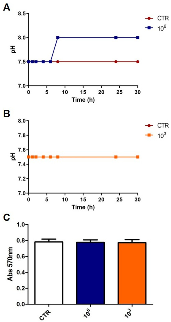 Effect of Serobioma on pH of medium and Caco-2 viability. (A,B) pH evaluation after 2, 4, 6, 8, 24, and 30 h of cell incubation with or without Serobioma (106 CFU/mL and 103 CFU/mL, respectively). (C) Caco-2 viability assay after 6 h of incubation with or without Serobioma (106 and 103 CFU/mL). CTR: Caco-2 cells incubated with medium alone (n = 4); 106: Caco-2 cells incubated with 106 CFU/mL (n = 2); 103: Caco-2 cells incubated with 103 CFU/mL (n = 2). Each condition was tested in triplicate.