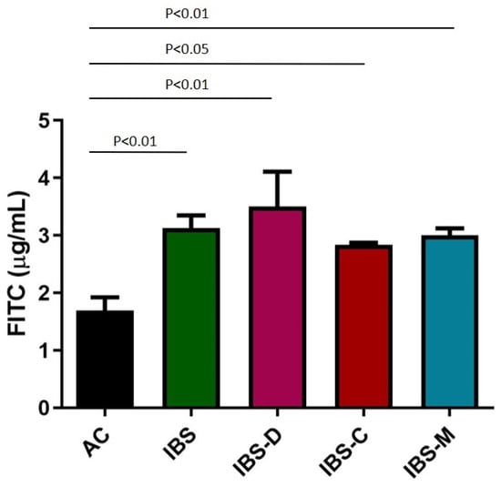 IBS supernatants caused a significant increase in paracellular permeability compared to the AC group after 6 h of incubation (p < 0.01). When analyzing IBS subtypes based on bowel habits, all subgroups showed a significant increase in Caco-2 paracellular permeability compared to the AC group (Figure 3).