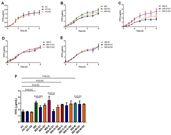 Effect of Serobioma being co-incubated with AC/IBS supernatants. (A) Effect of co-incubation of AC and Serobioma over time; (B) effect of co-incubation of IBS (IBS-D plus IBS-C plus IBS-M) and Serobioma over time; (C) effect of co-incubation of IBS-D and Serobioma over time; (D) effect of co-incubation of IBS-C and Serobioma over time; (E) effect of co-incubation of IBS-M and Serobioma over time; (F) depiction of paracellular permeability changes after 6 h of incubation. AC: Caco-2 cells incubated with AC supernatants; AC+S1: Caco-2 cells incubated with AC supernatants and 106 CFU/mL of Serobioma; AC+S2: Caco-2 cells incubated with AC supernatants and 103 CFU/mL of Serobioma; IBS: Caco-2 cells incubated with IBS-D supernatants plus Caco-2 cells incubated with IBS-C supernatants plus Caco-2 cells incubated with IBS-M supernatants; IBS+S1: Caco-2 cells incubated with IBS supernatants and 106 cell/well Serobioma; IBS+S2: Caco-2 cells incubated with IBS supernatants and 103 CFU/mL of Serobioma; IBS-D: Caco-2 cells incubated with IBS-D supernatants; IBS-D+S1: Caco-2 cells incubated with IBS-D supernatants and 106 CFU/mL of Serobioma; IBS-D+S2: Caco-2 cells incubated with IBS-D supernatants and 103 CFU/mL of Serobioma; IBS-C: Caco-2 cells incubated with IBS-C supernatants; IBS-C+S1: Caco-2 cells incubated with IBS-C supernatants and 106 CFU/mL of Serobioma; IBS-C+S2: Caco-2 cells incubated with IBS-C supernatants and 103 CFU/mL of Serobioma; IBS-M: Caco-2 cells incubated with IBS-M supernatants; IBS-M+S1: Caco-2 cells incubated with IBS-M supernatants and 106 CFU/mL of Serobioma; and IBS-M+S2: Caco-2 cells incubated with IBS-M supernatants and 103 CFU/mL of Serobioma.
