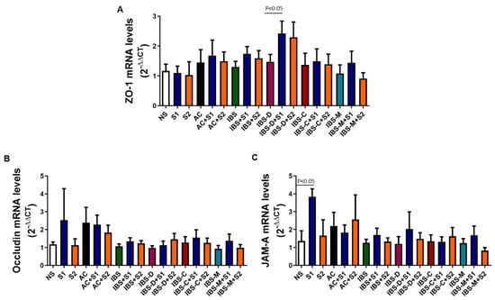 Effect of Serobioma with/without AC/IBS supernatants on ZO-1 (A), occludin (B), and JAM-A (C) expression. NS: Caco-2 cells incubated with medium alone; S1: Caco-2 cells incubated with 106 CFU/mL of Serobioma; S2: Caco-2 cells incubated with 103 CFU/mL of Serobioma. AC: Caco-2 cells incubated with AC supernatants; AC+S1: Caco-2 cells incubated with AC supernatants and 106 CFU/mL of Serobioma; AC+S2: Caco-2 cells incubated with AC supernatants and 103 CFU/mL of Serobioma; IBS: Caco-2 cells incubated with IBS-D supernatants plus Caco-2 cells incubated with IBS-C supernatants plus Caco-2 cells incubated with IBS-M supernatants; IBS+S1: Caco-2 cells incubated with IBS supernatants and 106 cell/well Serobioma; IBS+S2: Caco-2 cells incubated with IBS supernatants and 103 CFU/mL of Serobioma; IBS-D: Caco-2 cells incubated with IBS-D supernatants; IBS-D+S1: Caco-2 cells incubated with IBS-D supernatants and 106 CFU/mL of Serobioma; IBS-D+S2: Caco-2 cells incubated with IBS-D supernatants and 103 CFU/mL of Serobioma; IBS-C: Caco-2 cells incubated with IBS-C supernatants; IBS-C+S1: Caco-2 cells incubated with IBS-C supernatants and 106 CFU/mL of Serobioma; IBS-C+S2: Caco-2 cells incubated with IBS-C supernatants and 103 CFU/mL of Serobioma; IBS-M: Caco-2 cells incubated with IBS-M supernatants; IBS-M+S1: Caco-2 cells incubated with IBS-M supernatants and 106 CFU/mL of Serobioma; and IBS-M+S2: Caco-2 cells incubated with IBS-M supernatants and 103 CFU/mL of Serobioma. Expression was calculated considering corresponding condition without Serobioma as calibrator (e.g., the expression of “IBS-D+S1” was calculated using “IBS-D” as calibrator).