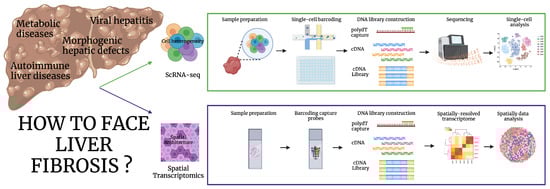 Furthermore, the combination of ST and scRNA-seq liver architecture can be used in a very informative way. Refer to Figure 1, which summarizes the two main focuses of liver fibrosis research and the methods to investigate it.