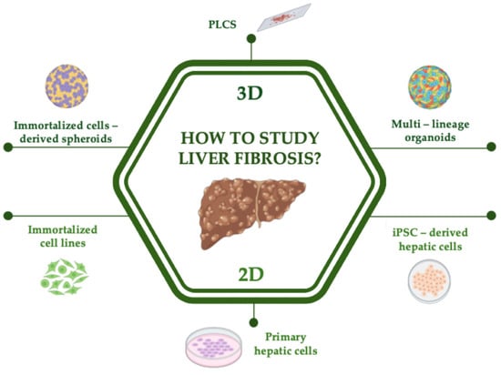 Due to the complexity of liver architecture and heterogeneous cell populations, researchers tried to study liver fibrosis using different model systems and approaches. The main models are illustrated in Figure 2.