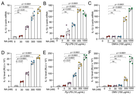 We first examined the effects of NA on the Pg LPS-induced expression of IL-1β by quantitative reverse transcription polymerase chain reaction (qPCR). Pg LPS (10 μg/mL) and OMVs (150 μg of protein/mL) induced the expression of IL-1β mRNA, as previously reported [19,20] (Figure 1B,C). BV-2 microglia were treated with a combination of NA and Pg virulence factors. The treatment of BV-2 microglia with a combination of NA (30–1000 nM) and Pg LPS resulted in a significant enhancement of the IL-1β mRNA expression by up to 9.0-fold relative to treatment with NA alone or Pg LPS alone in a concentration-dependent manner (Figure 1A,B). A combination of both NA and OMVs also led to an increase in the IL-1β mRNA expression of up to almost 12.8-fold relative to treatment with NA alone or OMVs alone in a concentration-dependent manner (Figure 1A,C). These observations suggest that NA exhibits a synergistic effect on the Pg virulence factor-induced IL-1β expression of mRNA expression in BV-2 microglia.