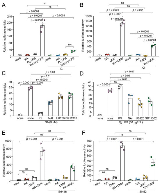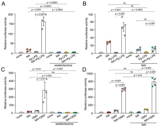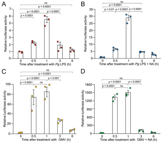 Time course of the mean relative luciferase activity of the IL-1β probe induced by Pg LPS, OMVs, and their combination with NA. (A,B) The mean relative luciferase activity of the IL-1β probe induced by either Pg LPS alone (10 μg/mL) (A) or combination with NA (1 μM) (B). (C,D) The mean relative luciferase activity of the IL-1β probe induced by either OMVs alone (150 μg of protein/mL) (C) or combination with NA (1 μM) (D). Data relative to the values are presented as the mean ± SE of 3 independent experiments. ns: not statistically significant.