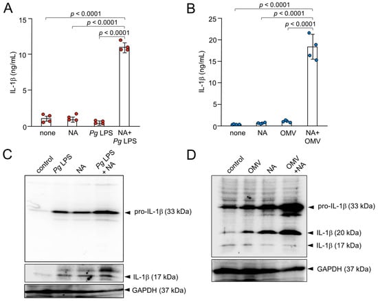 Production of IL-1β by BV-2 microglia following treatment with NA, Pg virulence factors, and their combination. (A) The mean concentration IL-1β in the cell lysates of BV-2 microglia following treatment with NA (1 μM), Pg LPS (10 μg/mL), and their combined application. (B) The mean concentration of IL-1β in the cell lysates of BV-2 microglia following treatment with NA (1 μM), OMVs (150 μg of protein/mL), and their combined application. Data are presented as the mean ± SE of 4 independent experiments. (C) Cell lysates from BV-2 microglia following treatment with NA (3 μM), Pg LPS (30 μg/mL), or their combined application for 1 h were subjected to immunoblotting of IL-1β. (D) Cell lysates from BV-2 microglia following treatment with NA (3 μM), OMVs (150 μg of protein/mL), or their combined application for 1 h were subjected to immunoblotting of IL-1β. Immunoblotting of GAPDH was used as a loading control.