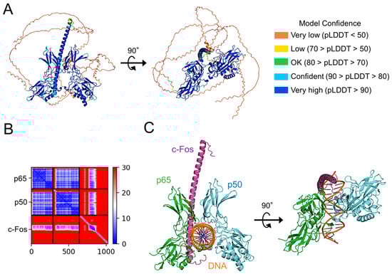 Prediction of c-Fos binding to NF-κB p65:p50 heterodimer. (A) The structural model of c-Fos-bound NF-κB p65:p50 heterodimer generated using AlphaFold2, presented as a ribbon colored pLDDT score. c-Fos binds to the molecular surface of p65. The figure to the right shows the complex structure vertically rotated by 90° from the figure to the left. (B) PAE plots of the c-Fos and p65:p50 complex model. (C) The structural model of the p65:p50:c-Fos complex forms a composite surface for DNA recognition. For the model construction, DNA bound to the p65:50 heterodimer (PDB code 2I9T) was bound to the AlphaFold2 model of the p65:p50:c-Fos complex. The long disordered regions in the N-terminus and C-terminus of c-Fos were removed from the figure to facilitate visualization. The NF-κB of p65 and p50 are in green and light blue, respectively. c-Fos is in purple. The two DNA strands are in orange. The figure to the right shows the complex structure vertically rotated by 90° from the figure to the left. The figures were drawn using PyMOL 3.1 [27].