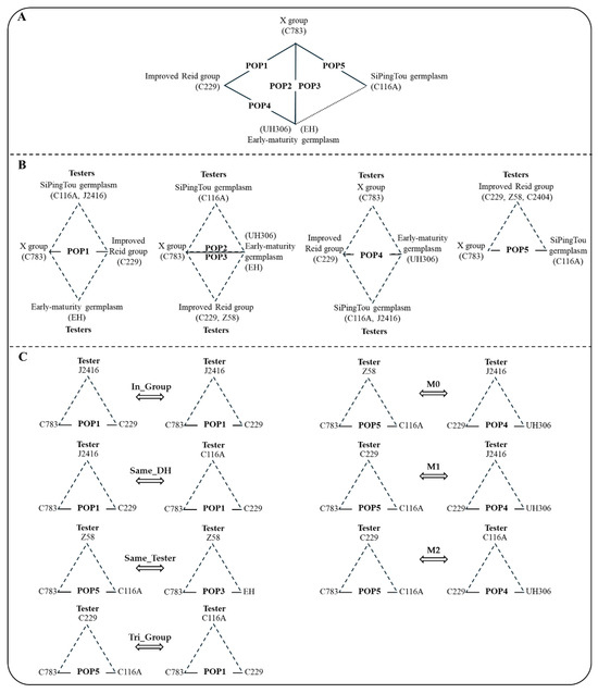 In this experiment, four inbred lines (C783, C229, C116A, and EH) bred by the laboratory and one introduced line (UH306) were used as the base materials for the production of the DH populations. These five parent lines belonged to four divergent heterotic groups: X group (C783), Improved Reid group (C229), SiPingTou germplasm (C116A), and Early-maturity germplasm (UH306, EH). Five DH populations were constructed using these five inbred lines, and the five DH populations were C783 × C229, C783 × UH306, C783 × EH, C229 × UH306, and C783 × C116A, which were labeled as POP1–5, respectively. Then, the five DH populations were tested against three inbred lines with heterosis, which were from the SiPingTou germplasm (C116A, J2416), Improved Reid group (C229, C2404, Z58), X group (C783), and Early-maturity germplasm (EH), yielding a total of 15 hybrid populations. The specific hybridization scheme is shown in Table S1.