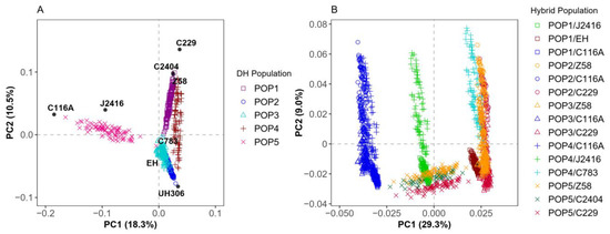 Genetic structures of the DH lines and the hybrid panels: (A) the principal component analysis for the DH panels; (B) the principal component analysis for the hybrid panels. The materials labeled in plot (A) represent the parents of the DH populations and the testers. In plot (B), the same testers share much the same colors.