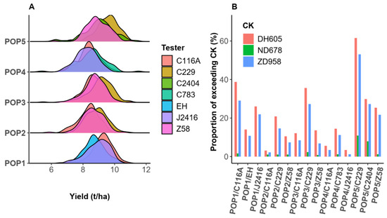 Yield distribution and proportion of hybrids exceeding the check in the hybrid populations: (A) yield distribution of the hybrid populations; (B) proportion of hybrids in the population exceeding the CK yield.