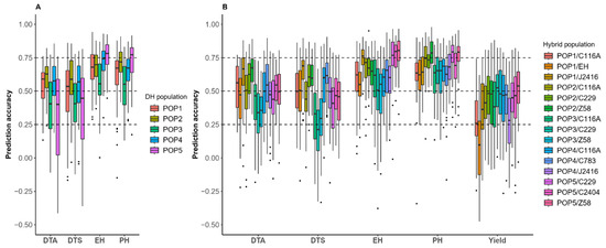 Prediction accuracy of each trait within DH and hybrid populations: (A) prediction accuracy of DH populations for different traits; (B) prediction accuracy of hybrid populations for different traits. The traits included days to anthesis (DTA), days to silking (DTS), ear height (EH), plant height (PH), and yield.
