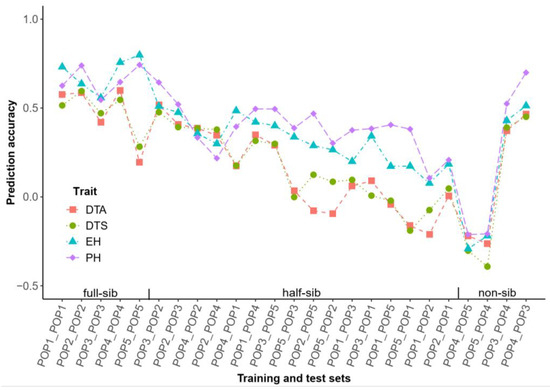 Through observing the prediction accuracy for different phenotypes and combinations in the inter-heterotic-group DH populations, we found that the prediction accuracies of PH and EH in the cross DH populations were generally higher than those for DTA and DTS (except for the pairs POP4_POP5, POP2_POP4, POP4_POP2, and POP3_POP2). The average prediction accuracies across all phenotypes for half-sibs were between those of full-sibs and non-sibs, except for POP4_POP2 and POP3_POP2. POP2 and POP3, which belonged to the same heterotic pattern, exhibited the highest mutual prediction accuracy, with average phenotypic prediction accuracies of 0.54 and 0.45, respectively, ranking first and third in terms of the DH cross population prediction accuracy. In the half-sib populations, POP1 and POP2 exhibited the lowest mutual prediction accuracy, while the prediction accuracy between the two unrelated populations—namely, POP5 and POP4—was the lowest. In this experiment, the between-population prediction accuracy of half-sibs varied depending on the different parents. The prediction accuracy for half-sibs of UH306 was higher than that of C229, while C229 outperformed C783. Although an unrelated population relationship existed between POP4 and POP3, both EH and UH306 shared the same heterotic group. Despite this, the average prediction accuracy for all traits in both populations was 0.35. Consequently, the mutual prediction accuracy between POP4 and POP3 was higher than the average when compared to the half-sib predictions involving C783 (Figure 5). The cross population prediction accuracy was more favorable when the no-shared parents of half-sibs belonged to the same heterotic group.