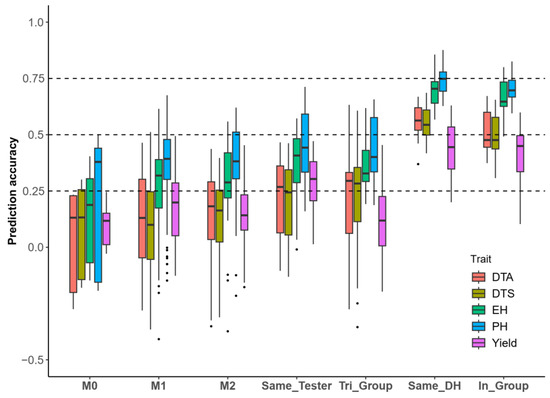 Therefore, we classified the predictions among hybrid populations into seven categories based on the parents of the DH populations and testers, including the following: (1) predictions within the populations (In_Group); (2) predictions between different testers within the same DH populations (Same_DH); (3) predictions between different DH populations within the same testers (Same_Tester); and (4) predictions within the “triangular” heterotic groups (DH parents and testers in the training and test sets sharing three identical heterotic groups “Tri_Group”); and (5–7) in addition to the above types, there were 0–2 shared inbred lines between the training and the test sets of the DH parents and the testers (M0, M1, M2) (Figure 1C). In terms of PH, EH, DTA, and DTS, Figure 6 shows that the prediction accuracy within populations and cross hybrid populations of Same_DH was higher than that of cross population predictions involving Same_Tester or Tri_Group. Furthermore, the accuracy of cross population predictions involving Same_Tester or Tri_Group was generally higher than or similar to those of M0, M1, and M2. In the prediction of yield, the prediction accuracy for Same_DH was higher than that for Same_Tester and better than that for the other types of populations. Overall, the cross population prediction pattern of Same_DH is feasible.