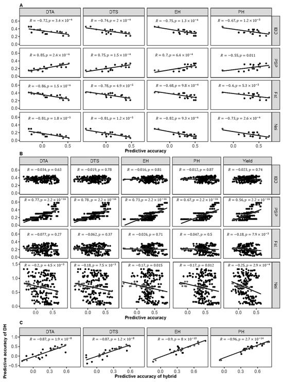 Correlations between cross population prediction accuracy and genotypic character of cross population regarding DH or hybrid population: (A) correlations between predictive accuracy and genotypic character of cross DH populations; (B) correlations between predictive accuracy and genotypic character of cross hybrid populations; (C) correlations between DH and hybrid populations in terms of prediction accuracy.