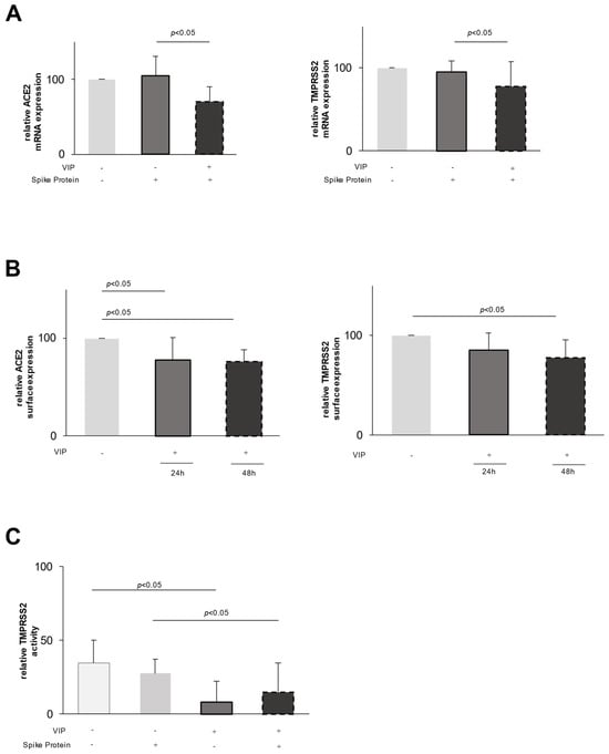 In addition, we were able to display that VIP induces the shedding of ACE2 and TMPRSS2 from the surface, which contributes to the reduction of the surface expression of these receptors. The emerging soluble ACE2 (sACE2) competes with membrane-bound ACE2 for spike proteins [] and can potentially be used as a form of trap for the virus. Yeung et al. (2021) showed that lower concentrations of sACE2 are not as effective as high concentrations in reducing cell infection and can even increase the susceptibility of the cells to SARS-CoV-2 []. This indicates that the strong stimulation of shedding of ACE2 is needed to reduce the infection of the target cells.