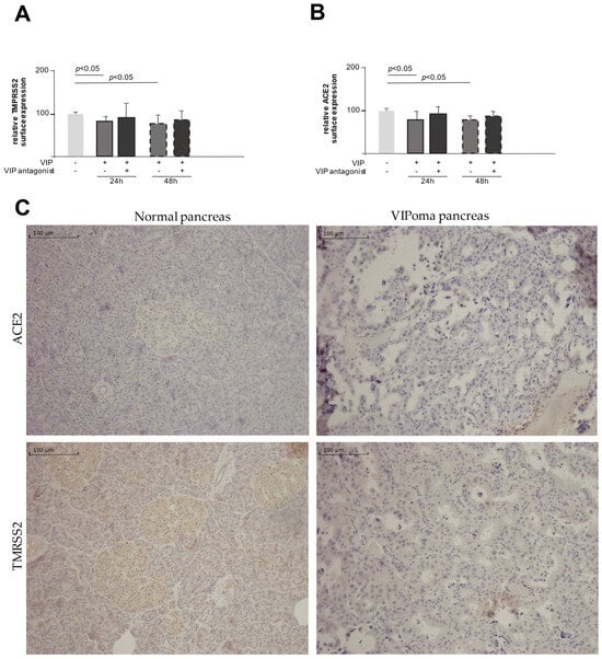 Figure 2A,B clearly demonstrate that the addition of the VIP antagonist abrogates the VIP-induced downregulation of ACE and TMPRSS2 mRNA, emphasizing a specific VIP effect. To further link these in vitro findings to the in vivo situation, we studied qualitatively the expression of TMPRSS2 and ACE2 in the histological samples from two patients with diagnosed VIP-producing tumors and two control samples of pancreatic tissue (Bani Sacchi et al., 1992 []). Figure 2C demonstrates on the left the expression of ACE2 and TMPRSS2 in the normal pancreatic tissue, with moderate expression of both proteins. In contrast, the histological expression of ACE2 and TMPRSS2 is markedly reduced in the pancreatic tissue of patients with diagnosed VIPoma.