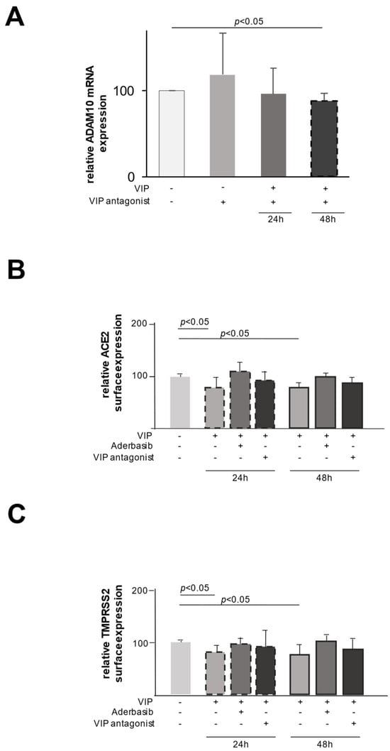 We, therefore, set out to test the effect of VIP on the expression of different proteases in epithelial cells. As shown in Figure 3A, the stimulation with VIP resulted in an increase in ADAM10 mRNA expression, which was completely abrogated by the addition of a specific VIP antagonist, emphasizing the specific enrollment of VIP. In line with these findings, the addition of a specific ADAM10 inhibitor (Aderbasib) to VIP-stimulated cells counteracts the VIP-mediated shedding of ACE2 and TMPRSS2 and, therefore, the downregulation of the respective surface expression (Figure 3B,C). These findings link the observed VIP-induced upregulation of ADAM10 to its proteolytic role in the process of the shedding of ACE2 and TMPRSS2.