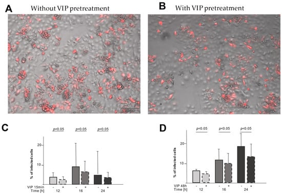 Pretreatment with VIP reduces the infection rate of epithelial cells with a non-pathogenic SARS-CoV-2 pseudovirus. (A) An example of a microscopic picture of epithelial cells infected with a SARS-CoV-2 pseudovirus without pretreatment with VIP (10 µg/mL). Only infected cells show a red fluorescence signal. (B) Pretreatment with VIP (10 µg/mL) leads to a reduction in the number of infected epithelial cells. The pictures are an overlay of phase contrast and mCherry fluorescent photomicrographs (100× magnification). (C) Pretreatment with VIP (10 µg/mL) for 15 min before infection with a SARS-CoV-2 pseudovirus significantly reduces the percentage of infected epithelial cells (12 h n = 7, 16 h n = 5, 24 h n = 9). Light grey stands for stimulation with pseudovirus for 12 h, darker grey for stimulation for 16 h and black for stimulation for 24 h. Solid outline stands for no VIP pretreatment and dashed outline stands for VIP pretreatment (D) Pretreatment with VIP (10 µg/mL) for 48 h before infection with a SARS-CoV-2 pseudovirus significantly reduces the percentage of infected epithelial cells (12 h n = 6, 16 h n = 6, 24 h n = 6). Light grey stands for stimulation with pseudovirus for 12 h, darker grey for stimulation for 16 h and black for stimulation for 24 h. Solid outline stands for no VIP pretreatment and dashed outline stands for VIP pretreatment.