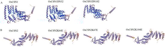 The protein structures of both OsCSN1DN32 and OsCSN1DN102 were predicted using AtCSN1 as the template. OsCSN1DN32 lacked only 32 amino acids at the N-terminus end, which had almost no effect on the structure of CSN1, while the protein structures of OsCSN1DN102 differed significantly from that of OsCSN1 (Figure 1A). The protein structures of OsCSN2, OsCSN2K64E, OsCSN2K67E, and OsCSN2K104E were predicted using AtCSN2 as the template. This suggested that mutations at these loci did not greatly affect the overall structure of CSN2 (Figure 1B).