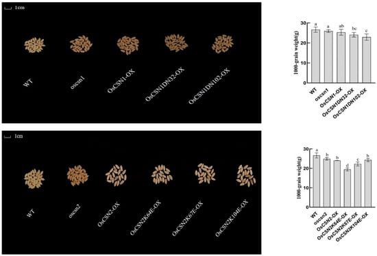 The 1000-grain weight of WT, OsCSN1 mutants, and OsCSN2 mutants. Data are mean ± SD. Means with different letters are significantly different (p < 0.05).