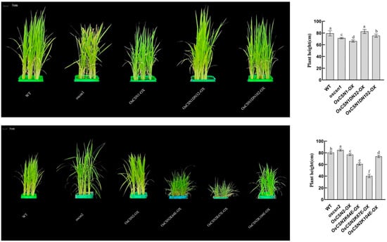 Plant height of WT, OsCSN1 mutants, and OsCSN2 mutants. Data are mean ± SD. Means with different letters are significantly different (p < 0.05).