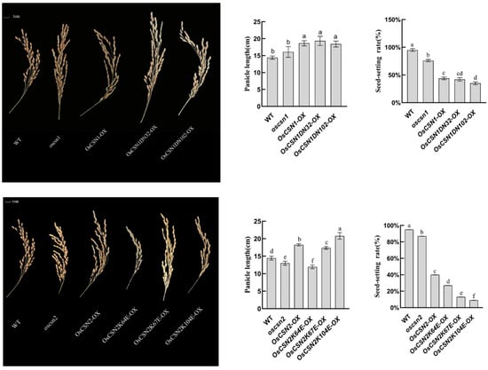 Panicle length and seed-setting rate of WT, OsCSN1 mutants, and OsCSN2 mutants. Data are mean ± SD. Means with different letters are significantly different (p < 0.05).