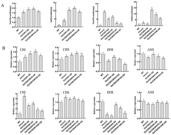 The contents of total flavonoids in the wild type, oscsn2, OsCSN2-OX, OsCSN2K64E-OX, OsCSN2K67E-OX, and OsCSN2K104E-OX were 0.980 mg/g, 9.794 mg/g, 5.236 mg/g, 6.381 mg/g, 2.350 mg/g, and 1.950 mg/g, respectively. The contents of anthocyanin in the wild type, oscsn2, OsCSN2-OX, OsCSN2K64E-OX, OsCSN2K67E-OX, and OsCSN2K104E-OX were 1.037 ug/g, 2.281 ug/g, 1.495 ug/g, 13.481 ug/g, 9.379 ug/g, and 6.136 ug/g, respectively (Figure 5A). These results showed that both the contents of total flavonoids and anthocyanin in mutants were significantly higher than those in the wild type, and the most significant differences were total flavonoids of the oscsn2 and anthocyanin of the OsCSN2K64E-OX. Compared with the OsCSN2-OX, the anthocyanin and total flavonoid contents of the mutants were high, except for the low total flavonoid content of the OsCSN2K67E-OX and OsCSN2K104E-OX. Among OsCSN2K64E-OX, OsCSN2K67E-OX, and OsCSN2K104E-OX, OsCSN2K64E-OX showed the most significant difference in anthocyanin content, OsCSN2K104E-OX showed the most significant difference in total flavonoid content, and they showed a decreasing trend in both total flavonoids and anthocyanin content.