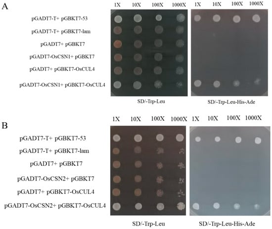We performed yeast two-hybrid analyses using OsCUL4 as bait and OsCSN1 and OsCSN2 as prey. The pGADT7-OsCSN1 + pGABKT7-OsCUL4 and pGADT7-OsCSN2 + pGABKT7-OsCUL4 co-transformed strain was able to grow on the media. The negative control (pGADT7-T + pGBKT7-lam, pGADT7 + pGBKT7, pGADT7-OsCSN2 + pGBKT7, pGADT7-OsCSN1 + pGBKT7, and pGADT7 + pGBKT7-OsCUL4) co-transformed strains were unable to grow. From the results of the yeast two-hybrid experiments, OsCSN1 and OsCSN2 had the ability to interact with OsCUL4 (Figure 6).