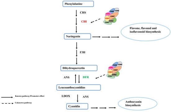Flavonoids are the main cause of color changes in rice glumes. Anthocyanins are first pigmented in the glumes away from the embryo and then gradually extend to the parts close to the embryo, pigmenting the whole pericarp, and the increase in anthocyanins may be the main reason for the brown color of the glumes []. So far, the related enzymes CHS/CHI, encoding flavonoid synthesis, the transcription factor MYB, the WKRY structural domain proteins, and the MYC proteins are inextricably linked to rice glume color. Under visible light irradiation, COP1/SPA ubiquitin ligase interacts with photoreceptors such as photopigments and cryptochromes and is inhibited, and transcription factors such as R2R3-MYB are no longer targeted for degradation and stabilized, resulting in the activation of a range of flavonoid synthesis-related genes [,]. Significant changes in the expressive ability of CHI and DFR in the flavonoid metabolic pathway were important in causing significant differential changes in the total flavonoid and anthocyanin contents of rice glumes, which gave the glumes different colors. We speculated that the significant up-regulation and down-regulation of key enzymes in the flavonoid metabolic pathway were due to the ubiquitination of key enzymes by the CSN complex. Therefore, we speculated that the ubiquitination function of CSN played a key role in the biosynthesis of flavonoids in rice.