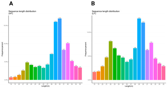 The sequence length distribution for the HF and LF samples shows distinct patterns in nucleotide length and frequency. In the HF sample, the most frequent sequence length is 30 nucleotides, comprising 16.92% of the total, followed closely by 29 nucleotides at 16.01%. Other notable peaks included 31 nucleotides at 8.27% and 32 nucleotides at 10.1%. This distribution indicates a concentration around the 29–32 nucleotide range (Figure 1A). In contrast, the LF sample has the highest frequency at 29 nucleotides (12.87%), followed by 30 nucleotides at 12.03%. Lengths of 22 and 32 nucleotides were also relatively frequent at 8.11% and 7.81%, respectively (Figure 1B) (Supplementary File S2).