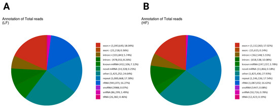 The distribution of total reads of non-coding RNA biotypes. Pie charts depicting the distribution of total reads of different biotypes of RNA species present in the sperm sncRNA datasets. The number and percentage of sRNAs reads mapped to exon (+/−) and intron (+/−)/known and novel miRNA/RNA/tRNA/snRNA/snoRNA/repeat. Different colors denote the types of RNA species. Both graphs indicate that the “other” category is the largest, with slightly higher values in the HF sample (27.93%) than the LF sample (24.64%). Repeat elements are similar in both (LF: 17.3%, HF: 17.54%). Exonic reads are slightly higher in the LF sample (18.04%) than the HF sample (17.02%), while intronic reads are more prevalent in the HF sample (intronic+: 5.55%, intronic−: 10.08%) compared to the LF sample (intronic+: 5.74%, intronic−: 8.26%), suggesting differences in transcript processing. (A) The annotation of total reads in the low-fertility sample (LF); (B) the annotation of total reads in the high-fertility sample (HF).