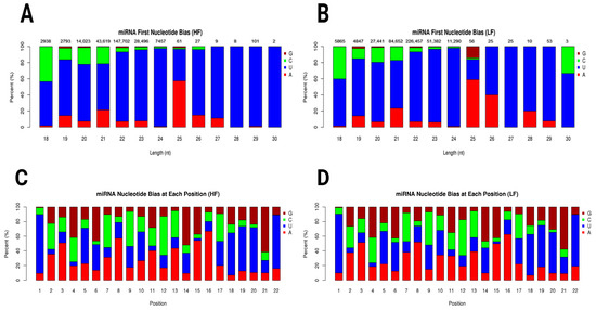 The miRNA first nucleotide bias plots for the HF and LF samples showed distinct patterns of nucleotide preferences across different miRNA lengths. In the HF sample, uracil (U) predominated across most miRNA lengths, especially in the 22–24 range compared to the 26–30 nucleotide range. Adenine (A) showed a modest presence, particularly in miRNAs of 25 nucleotides in length. Guanine (G) and Cytosine (C) were less represented in shorter miRNAs but appeared in notable quantities in specific lengths (Figure 3A). In the LF sample, a similar preference for uracil was observed, although the proportion of Cytosine (C) was slightly more pronounced in some length categories, particularly in shorter miRNAs such as those with 18 nucleotides. Adenine (A) also showed a moderate presence (Figure 3B). Graphs of miRNA nucleotide bias at each position for both the HF and LF groups showed distinct patterns in nucleotide representation across positions 1 through 22. At the first nucleotide position, uracil (U) was strongly predominant in both the HF and LF groups. As we moved from position 2 to 22, a mixture of all four nucleotides (G, C, U, and A) was observed, with uracil (U) and Adenine (A) generally seeming to have higher proportions than Guanine (G) and Cytosine (C) in many positions (Figure 3C,D). Novel miRNA first nucleotide bias is shown in Supplementary Figure S3.